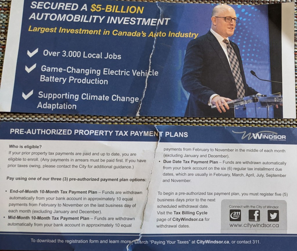 The mayor of Windsor, Ont., is defending a promotional insert included with tax bills that critics say looks like a campaign advertisement.